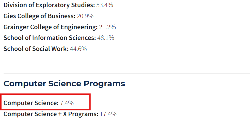 UIUC’s Grainger College of Engineering alone has an acceptance rate of 21.2%. But, for computer science, it’s even more daunting. As of 2025, UIUC had an acceptance rate of 7.4% for students applying to computer science.
